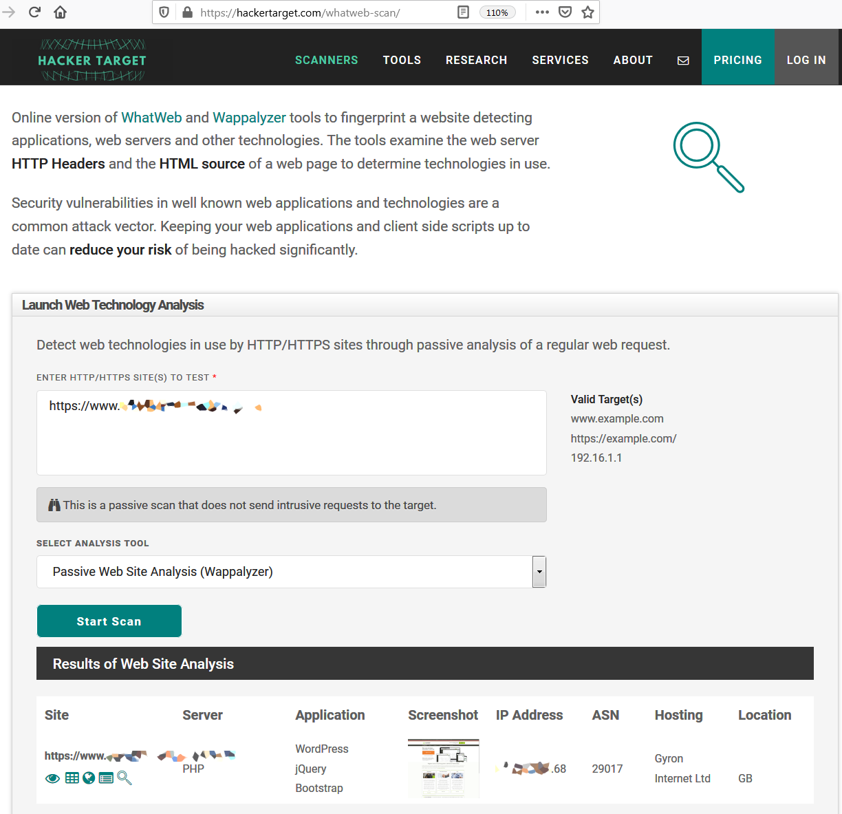Если у тебя нет VPN или ты просто не хочешь заморачиваться с установкой, обрати внимание на онлайновую версию WhatWeb. WhatWeb online