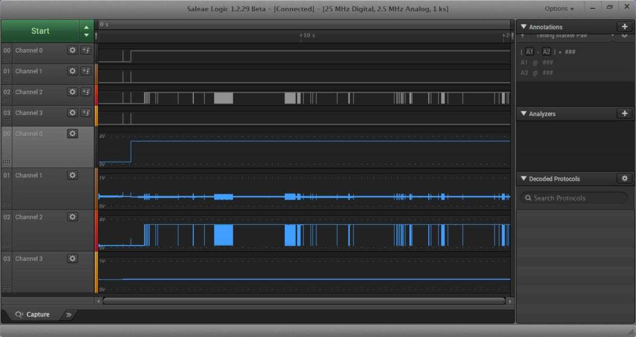 Теперь включаем логический анализатор и само устройство и смотрим, что из этого выйдет.