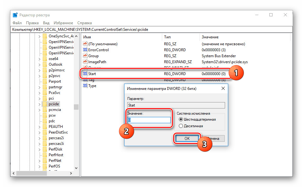 Затем точно таким же способом заходите в папку «pciide» раздела «services» и меняйте значение параметра «Start» на «0».