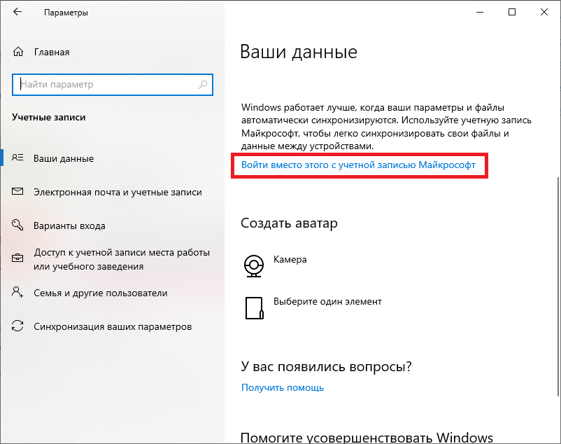 - На новой странице автоматически откроется вкладка «Ваши данные». Нажмём на ссылку «Войти вместо этого с учётной записью Microsoft».