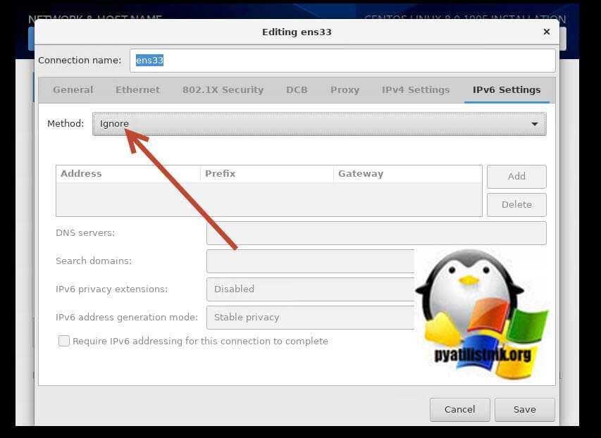 Если вы выбрали метод, который требует ввода параметров вручную, введите сведения об IP-адресе для этого интерфейса, маске сети и шлюзе. Используйте кнопки Добавить и Удалить, чтобы добавить или удалить адреса. Введите разделенный запятыми список DNS-серверов в поле DNS-серверов и разделенный запятыми список доменов в поле «Search Domain» для любых доменов, которые вы хотите включить в поиск серверов имен. При желании введите имя для этого сетевого подключения в поле идентификатора клиента DHCP (DHCP client ID).Это имя должно быть уникальным в подсети. Когда вы назначаете значимый идентификатор клиента DHCP для соединения, это соединение легко идентифицировать при устранении неполадок в сети. Снимите флажок, если он стоит «Require IPv6 addressing for this connection to complete (Требовать адресацию IPv6 для этого соединения для завершения)», чтобы разрешить системе устанавливать это соединение в сети с поддержкой IPv4, если конфигурация IPv6 не удалась, но конфигурация IPv4 прошла успешно. Сохраняем все сетевые настройки. Теперь можно сказать, что вы произвели базовую настройку сети при установке CentOS 8, можно дальше продолжить инсталляцию.