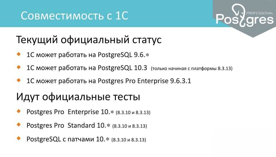 Как видите, мы не отказываемся от поддержки 1С обычного ванильного PostgreSQL.