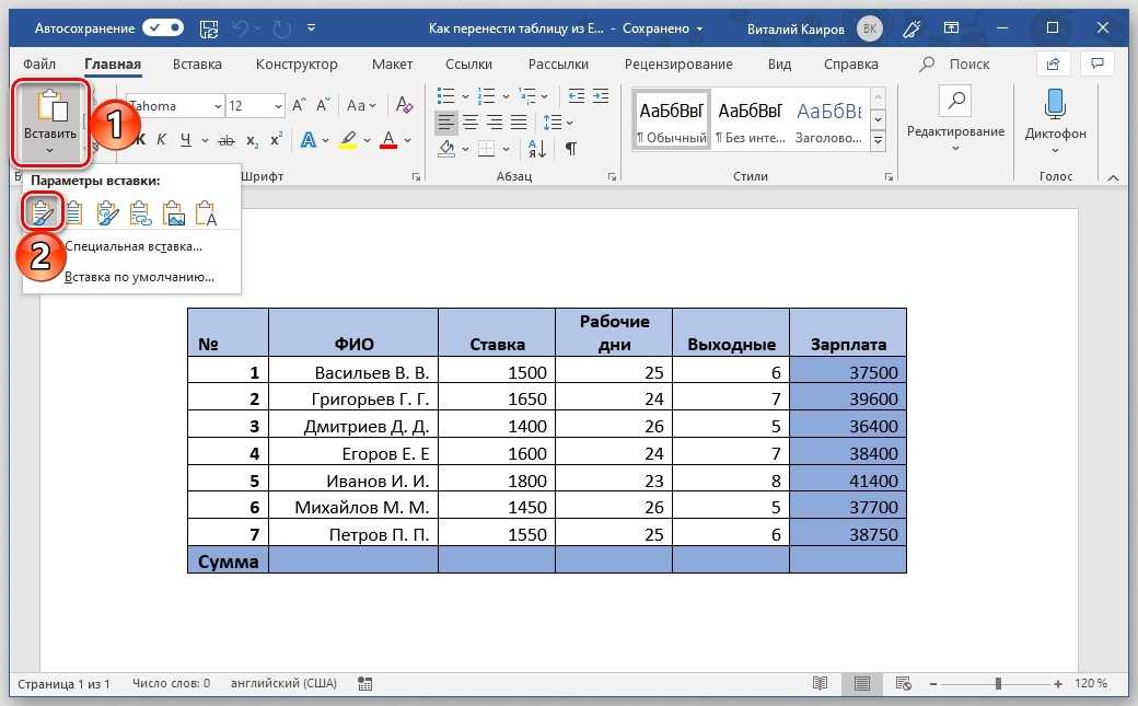 - во вкладке «Главная» выбрать опцию «Вставить» с сохранением исходного форматирования;