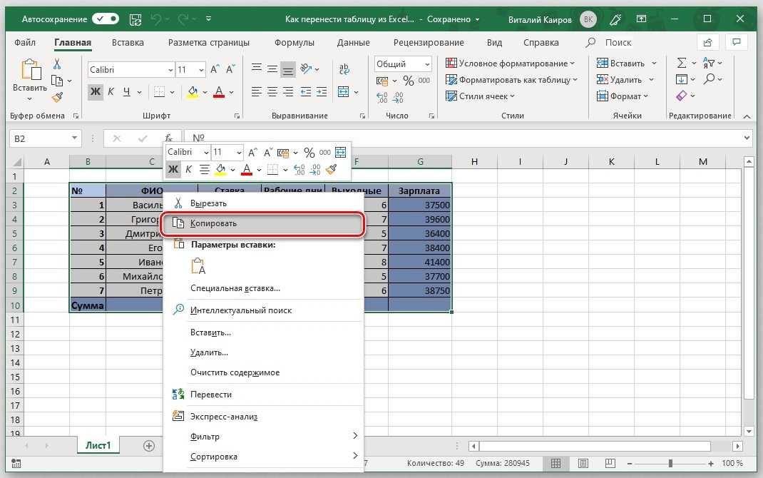 Щелкните правым кликом мыши по выделенной таблице. Скопируйте содержимое ячеек, нажав в диалоговом окне строку «Копировать».