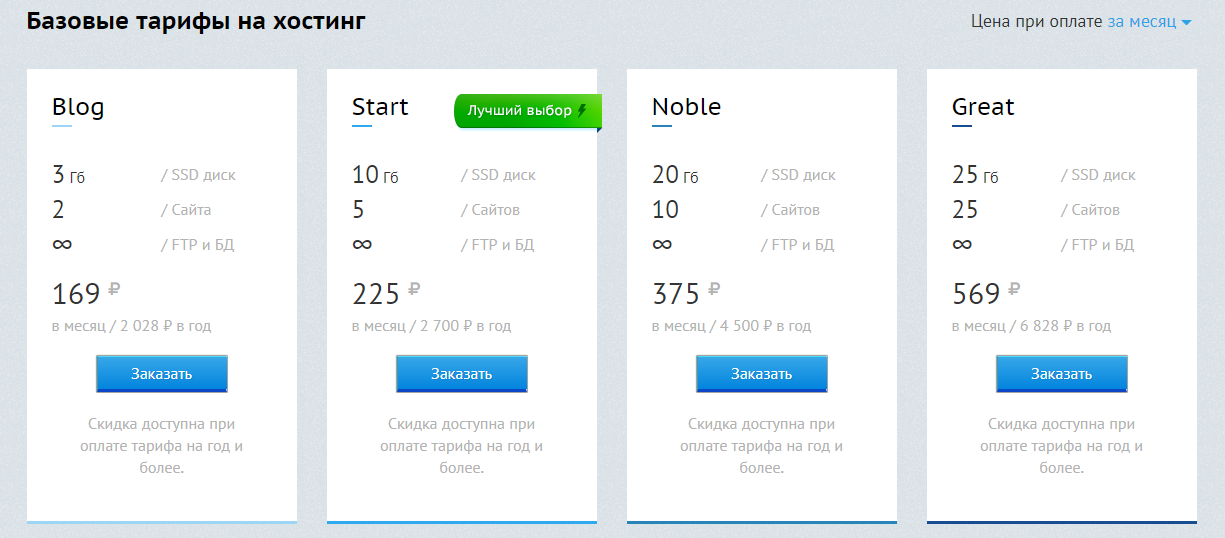 Цены на хостинг у «Бегета» не то чтобы сверхдемократичные – просто нормальные, средние по рынку. Чтобы разместить небольшой блог, можно купить тариф с соответствующим названием – дадут 3 Гб на SSD за 169 рублей в месяц. Кстати, первые 30 дней услугами хостера можно пользоваться бесплатно.