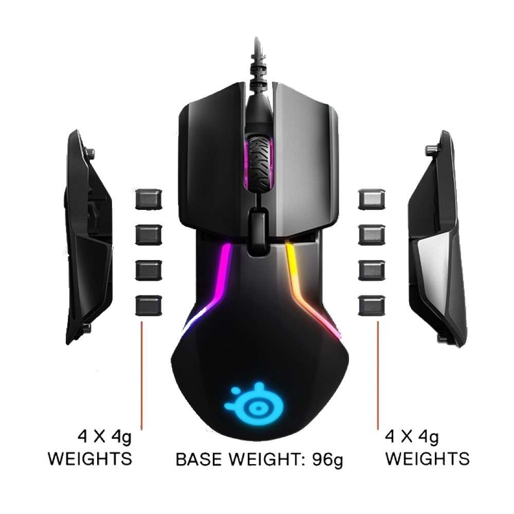 Мышки компании SteelSeries давно завоевали любовь и уважение как среди профессиональных киберспортсменов, так и геймеров-любителей. В этом году SteelSeries прочно укрепили свои позиции одного из лидеров на рынке, выпустив мышь SteelSeries Rival 600. Эта мышка обладает набором всех необходимых функций и даже немного больше. Съемный кабель, переключатели ресурсом до 60 млн кликов, корпус из высококачественного армированного волокна, 8 зон RGB подсветки, 32-битный процессор, 8 съемных грузика по 4г, 7 программируемых кнопок и расширение сенсора до 12000 DPI. Также имеется два датчика точности, один из которых позволяет отслеживать координаты приподнятой мышки в моменты отрыва от коврика.