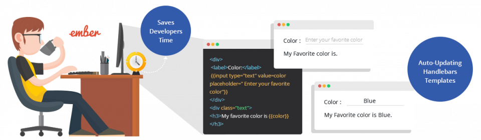 Ember был назван лучшим фреймворком Javascript еще в 2015 году. Сегодня сообщество Ember огромно, и оно постоянно расширяется, с новыми функциями и регулярно добавляемыми выпусками. Ember обладает двусторонней привязкой данных, которой может похвастаться Angular, и поставляется с множеством функций и компонентов, которые вы можете использовать прямо из коробки. Google, Microsoft, Heroku и Netflix часто используют эту платформу. Ember вращается вокруг производительности разработчика и пытается максимизировать ее, либо устраняя необходимость тратить время на действия, либо применяя некоторые передовые практики JS в своем основном дизайне.