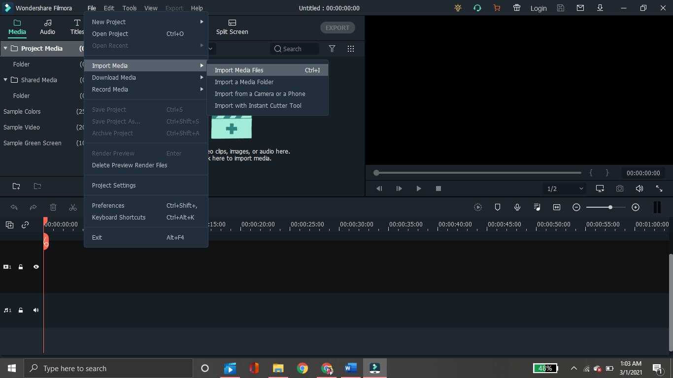 2. Нажмите на Файл, нажмите на Импорт медиа чтобы импортировать видео для создания Instagram reels.