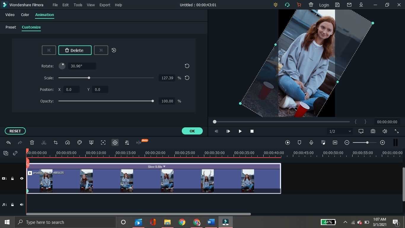 5. Далее, щелкните значок ромба для анимации по ключевым кадрам. Щелкните Preset(Пресет) чтобы выбрать существующую анимацию. Нажмите Настроить чтобы настроить поворот, положение, масштаб и прозрачность.