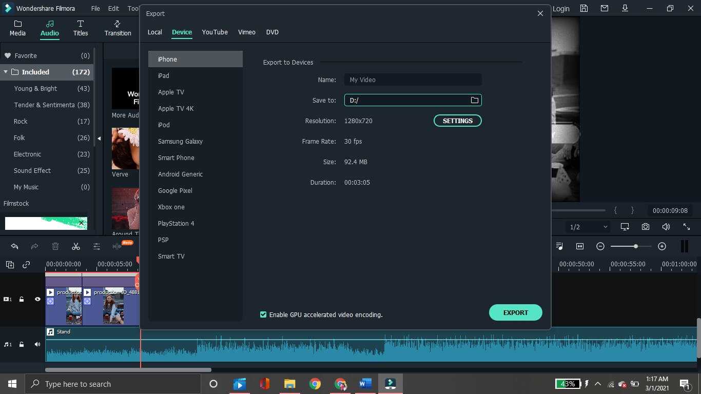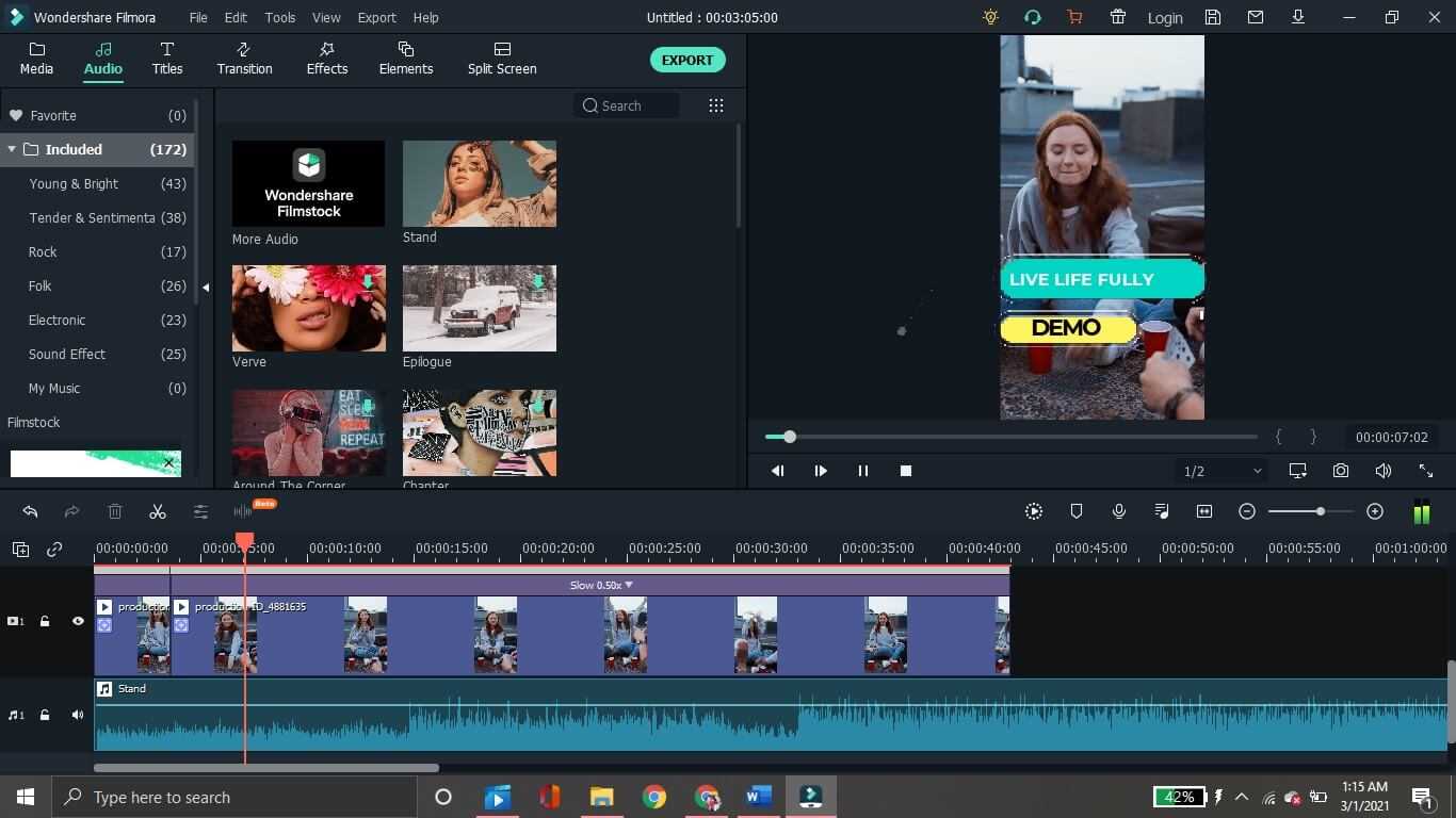 8. На панели Аудио, дважды щелкните, чтобы добавить любой саундтрек на таймлинию. Перетащите, чтобы настроить звук в соответствии с видео.