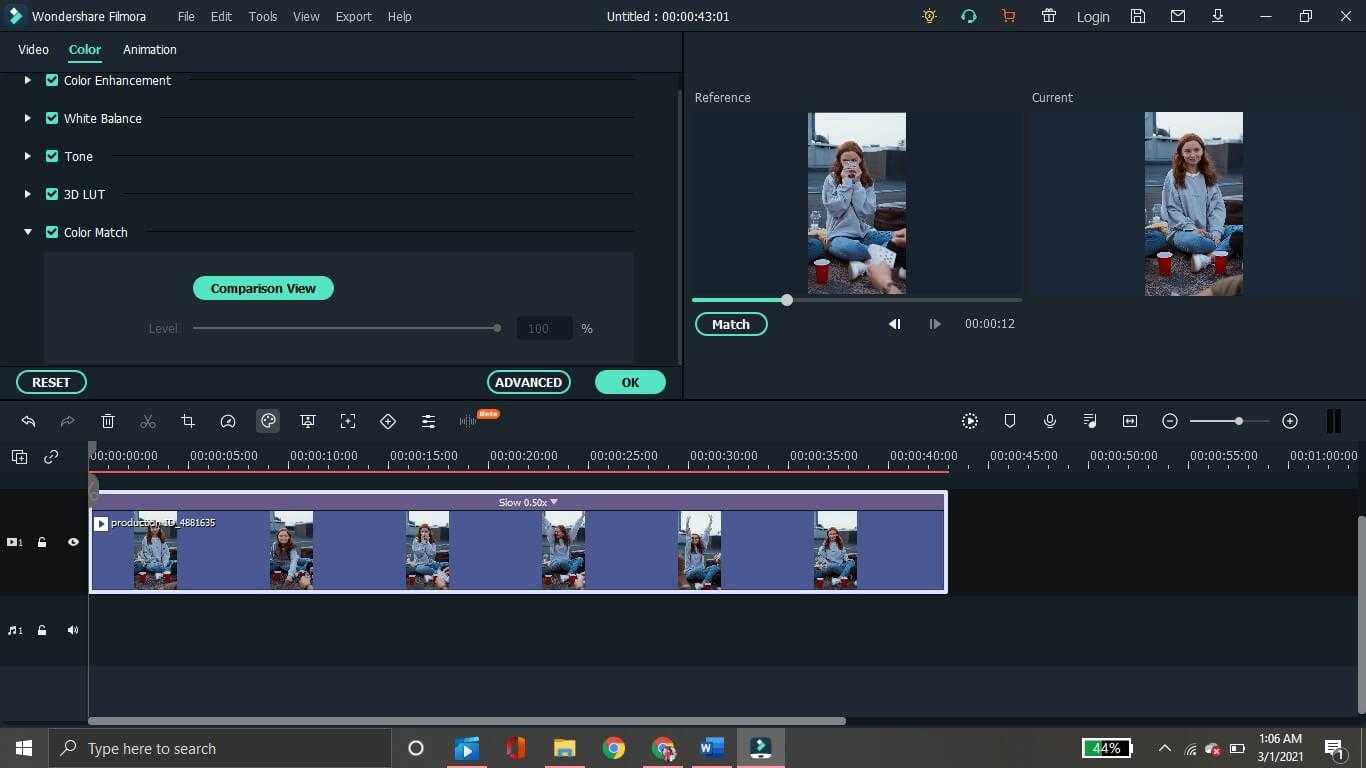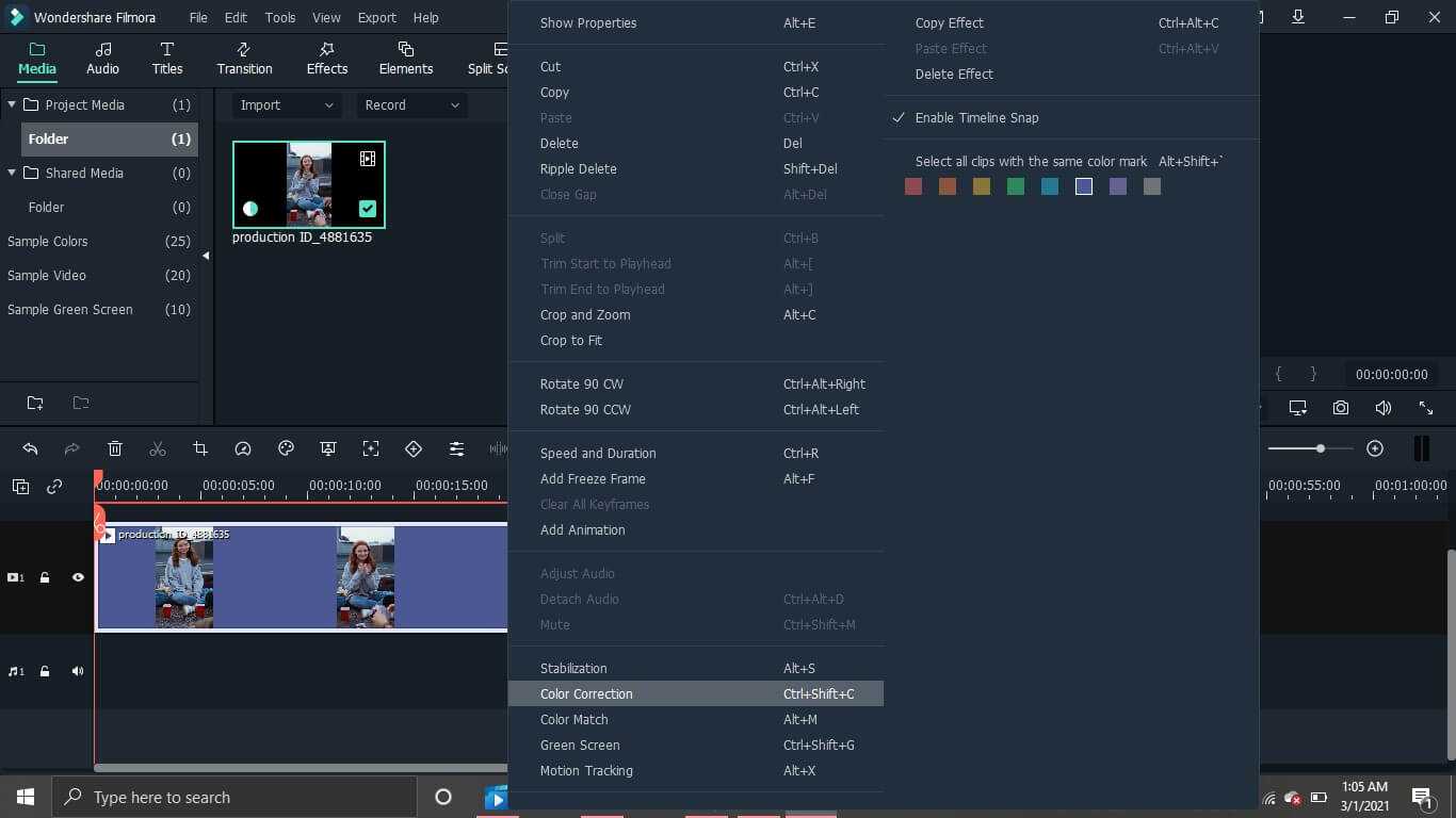3. Перетащите видео на таймлинию. На панели над таймлинией щелкните значок палитры красок и выберите Подбор цветов, чтобы цвета видео были согласованными.