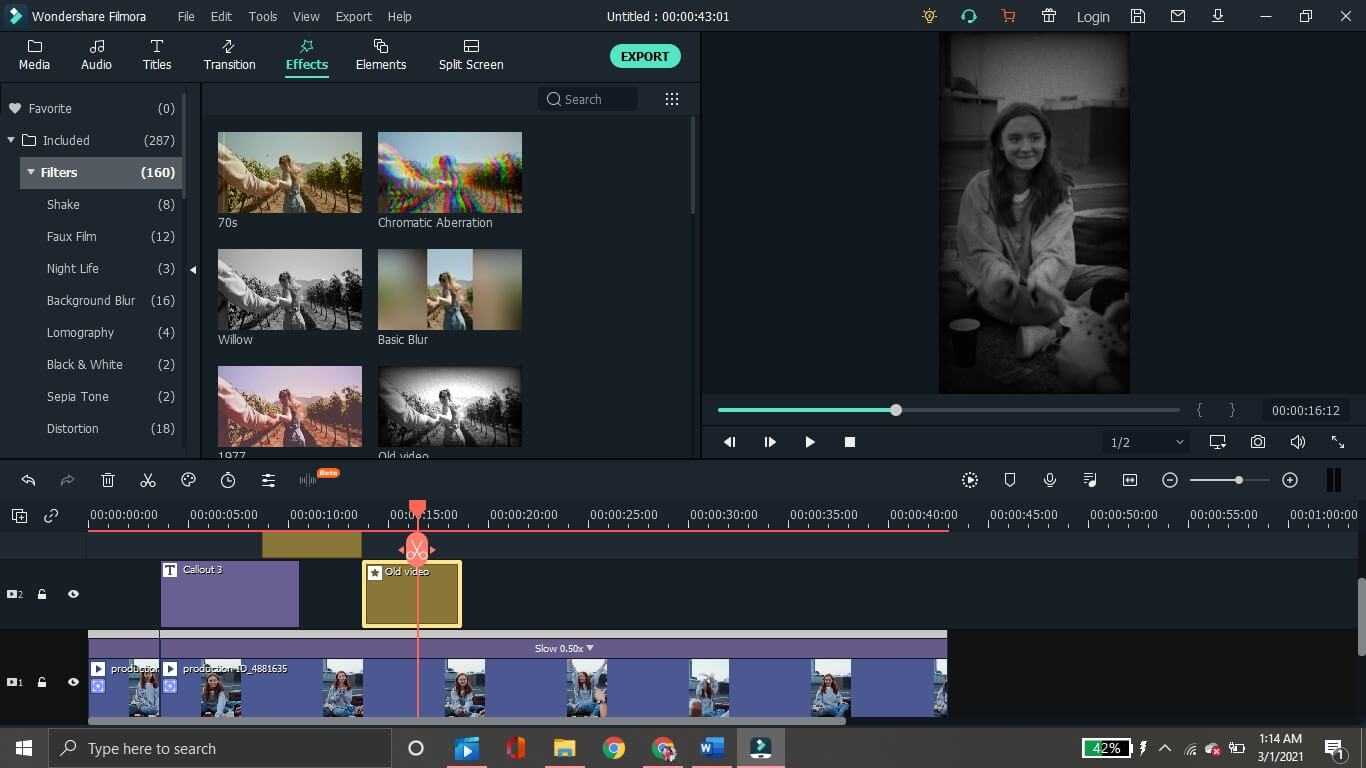 7. На панели Эффекты нажмите на Фильтры. Выберите фильтр и дважды щелкните, чтобы добавить его на шкалу времени. Перетащите и отрегулируйте продолжительность фильтра.