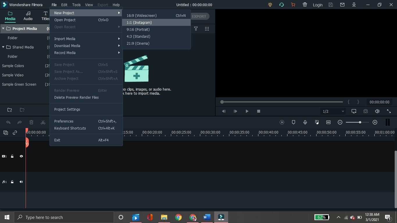 1. Скачайте и установите Filmora на ваш ПК. Нажмите на Файл, нажмите на Новый проект и выберите соотношение сторон 1:1.