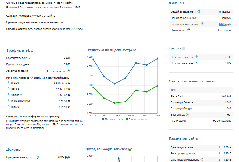 Еще один новостник о знаменитостях с блиц-ценой 149 100 приносит около 8 тысяч рублей чистой прибыли ежемесячно. Трафик — 2 406 уников в день, сайт существует с 2014 года, в Яндексе 1000 страниц. Сделан на CMS Ucoz.