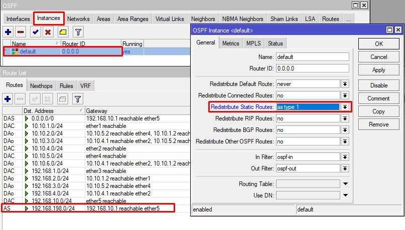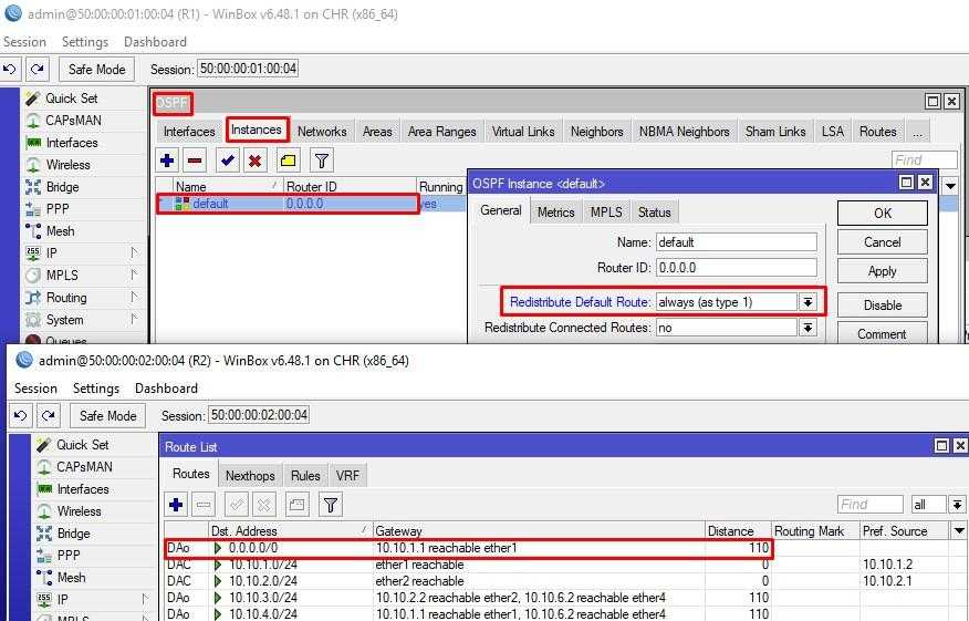 Настраиваем router-id как loopback. Для этого идем в routing — ospf, вкладка instance/ Выбираем наш экземпляр default, В поле router-id, вписываем ip адрес loopback интерфейса, 10.255.255.1