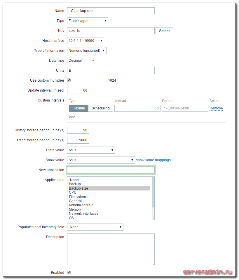 Кратко расскажу, что делать на сервере. Раньше я уже неоднократно рассматривал этот момент, поэтому не буду на нем подробно останавливаться. Больше информации можете получить в предыдущих статьях, которые я привел в самом начале. Идем в веб интерфейс. Выбираем хост, на котором мы только что настраивали агент, заходим в список итемов и добавляем новый: