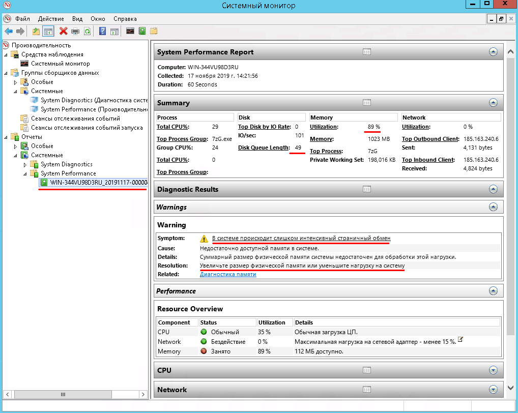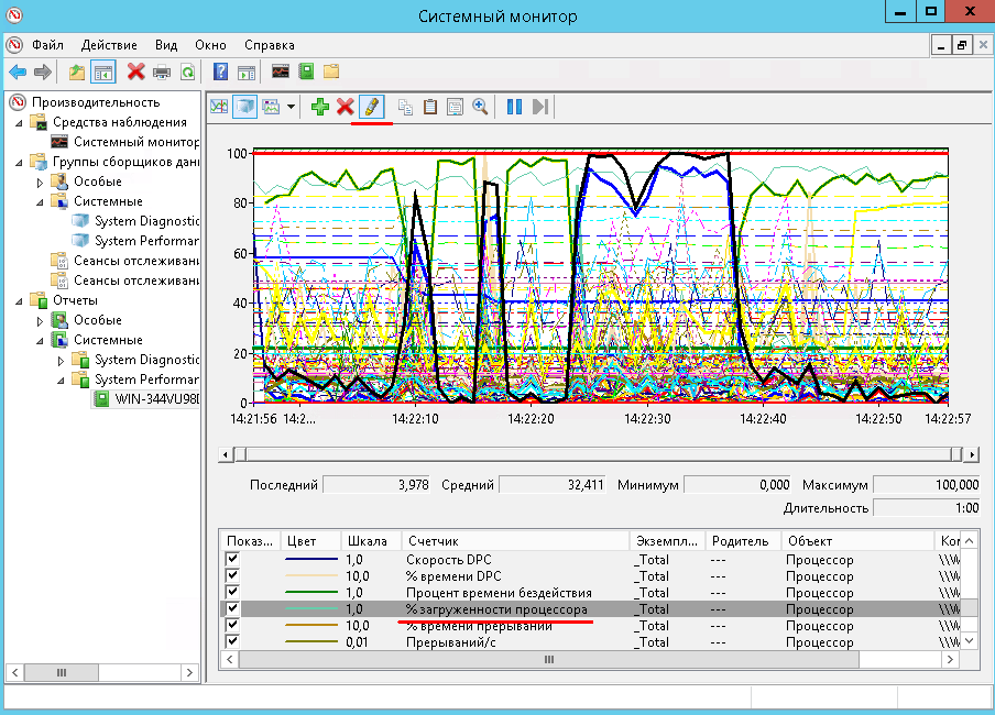 Рассмотрим диагностику используя готовую группу сборщиков данных “System Performance (Производительность системы)”