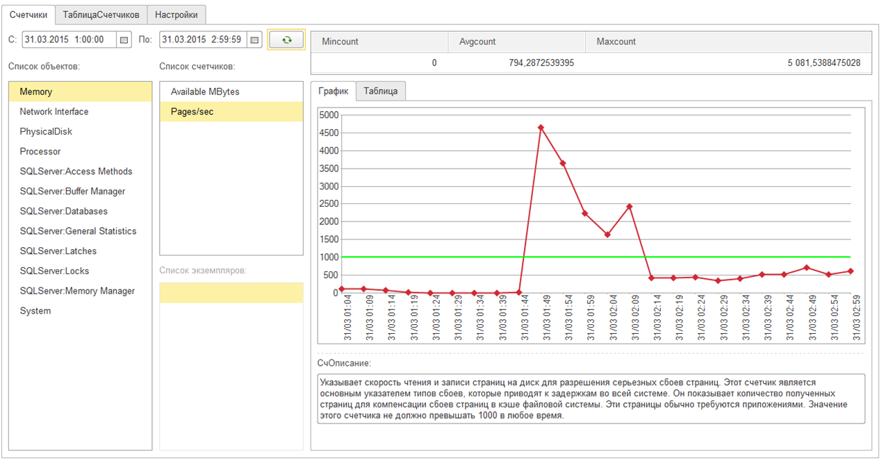 Стр = ТаблицаЭталонов.Добавить(); Стр.Имя = "pages/sec"; Стр.Значение = 1000; Стр.Описание = "Указывает скорость чтения и записи страниц на диск для разрешения серьезных сбоев страниц. Этот счетчик является основным указателем типов сбоев, которые приводят к задержкам во всей системе. Он показывает количество полученных страниц для компенсации сбоев страниц в кэше файловой системы. Эти страницы обычно требуются приложениями. Значение этого счетчика не должно превышать 1000 в любое время.";
