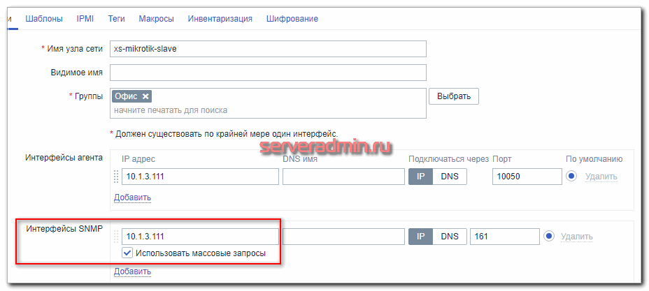 На первой вкладке указываем имя хоста, такое же, как на клиенте, добавляем в любую существующую группу и задаем ip адрес компьютера.