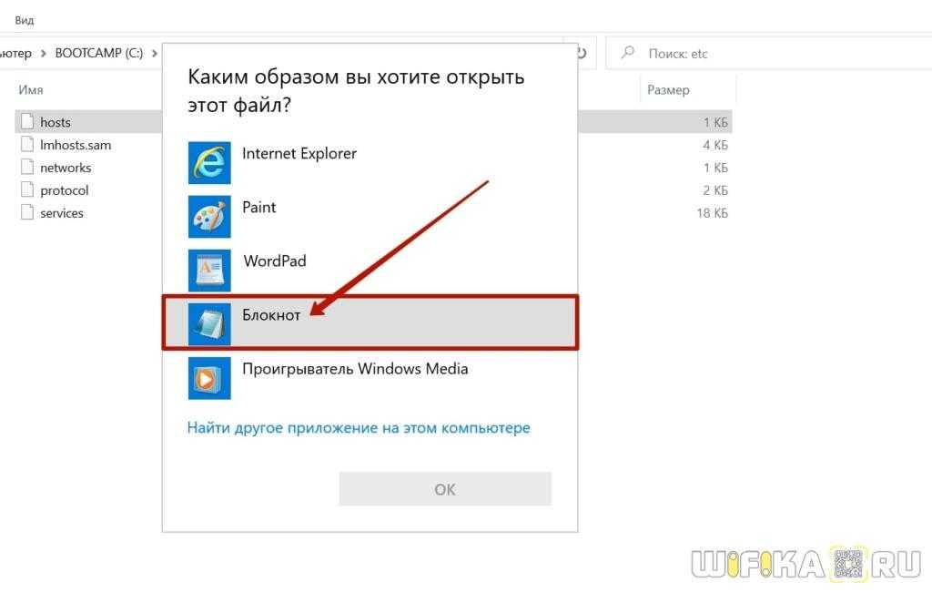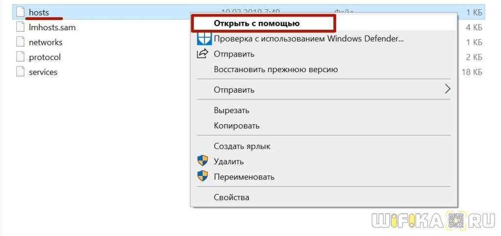 - Делаем ПКМ по файлу hosts, кликаем на «Открыть с помощью» и выбираем «Блокнот».