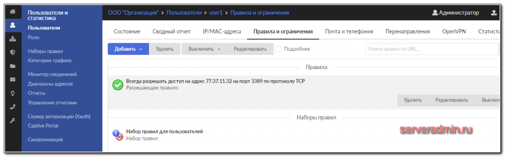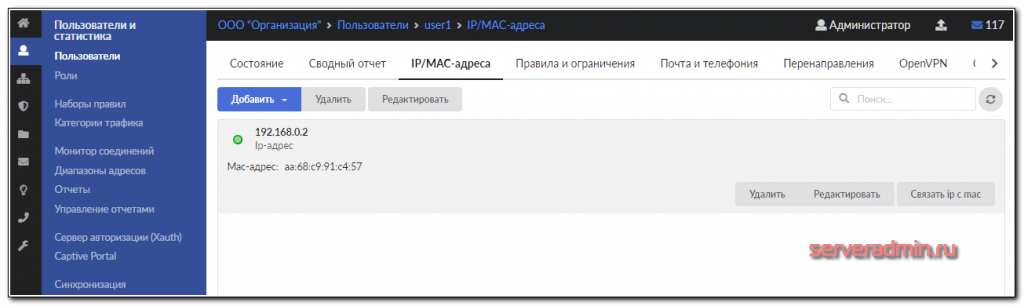 Идем в раздел Пользователи и Статистика -> Пользователи и добавляем нового пользователя. В настройках пользователя на вкладке IP/MAC-адреса указываем ip адрес этого пользователя.