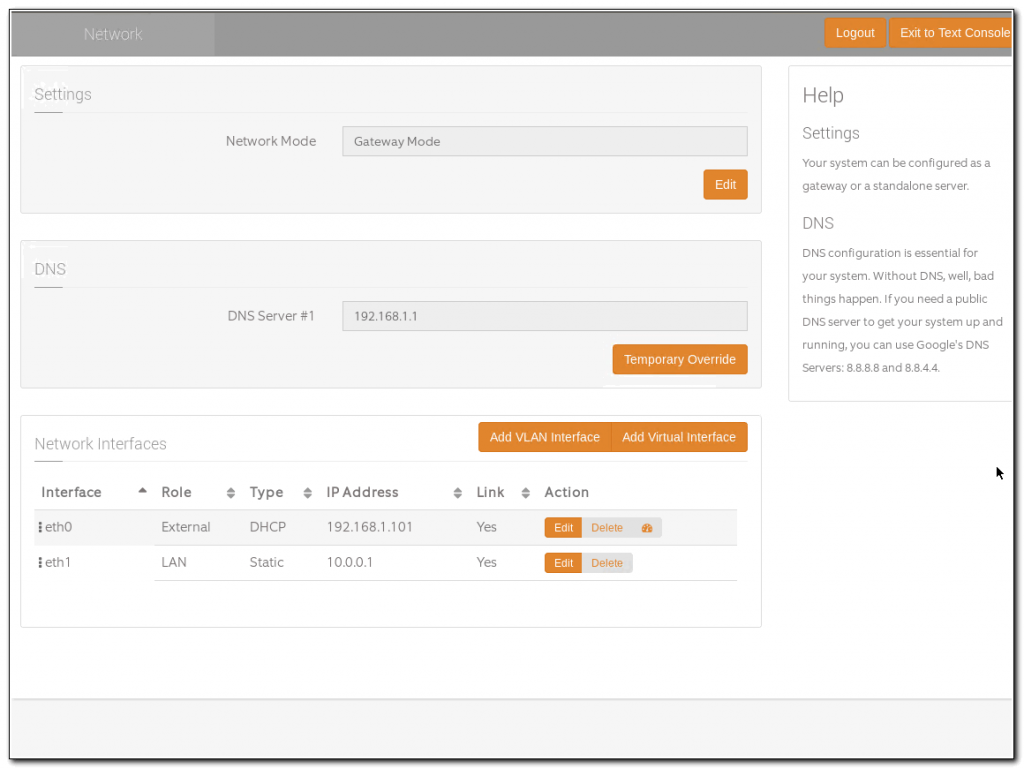В принципе, шлюз уже сейчас практически готов к работе. Нам нужно только выполнить начальную настройку сетевых адаптеров. Для этого идем в раздел Сеть -> Мастер настройки сети. Указываем параметры для WAN и LAN интерфейсов и применяем их. Рекомендую осмысленно называть интерфейсы. По именам потом проще будет оперировать в настройке firewall.