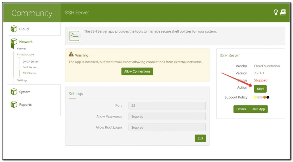Добавляете эти правила в Custom Firewall и сможете подключаться по ssh, предварительно запустив сервис в разделе Network -> Infrastructure -> SSH Server.