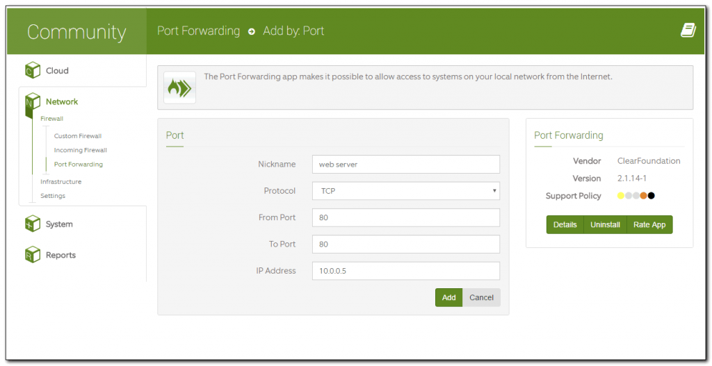 Теперь настроим проброс порта. Это сделать очень просто. Допустим, у нас есть web сервер по адресу 10.0.0.5. Нам надо настроить forward 80-го порта. Идем в раздел Network -> Firewall -> Port Forwarding и создаем новое правило, выбрав Add by: Port.