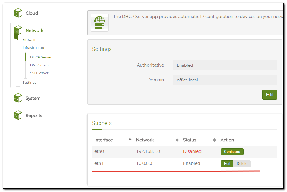 На этом все, начальная настройка clearos завершена. Можете настроить dashboard так, как вам нравится. Выбирать особо не из чего, поставьте те виджеты, что есть в наличии. Давайте сразу включим DHCP сервер. Идем в раздел Network -> Infrastructure -> DHCP Server и включаем его на локальном интерфейсе: