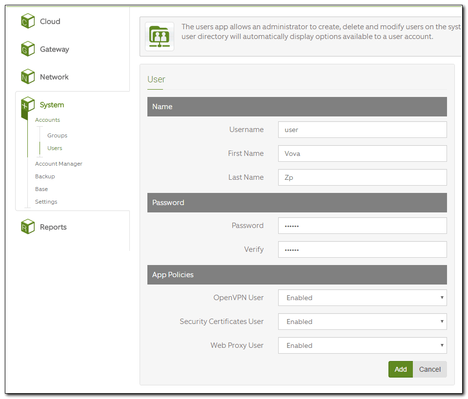 У меня получилось примерно так. Теперь нам нужно создать пользователя, на котором будем тренироваться. Если я правильно понял подход к организации доступа в интернет, то он выдается только тем, кому разрешено. То есть по умолчанию, сейчас шлюз в интернет никого не пускает. Добавим нового пользователя и назначим ему IP адрес.