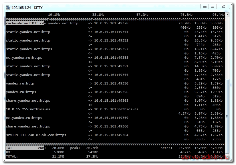 Обращаю внимание, что я смотрю загрузку локального интерфейса eth1. Если смотреть на eth0, то мы увидим только исходящие соединения сервера