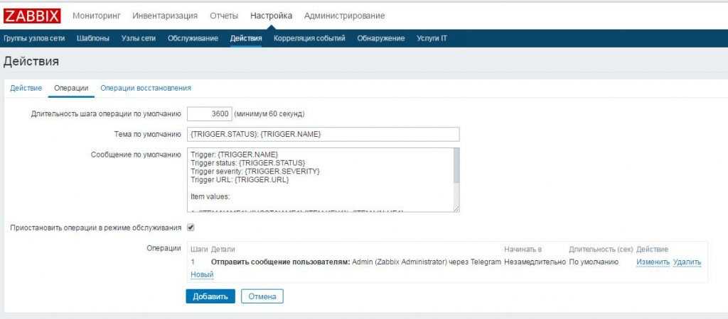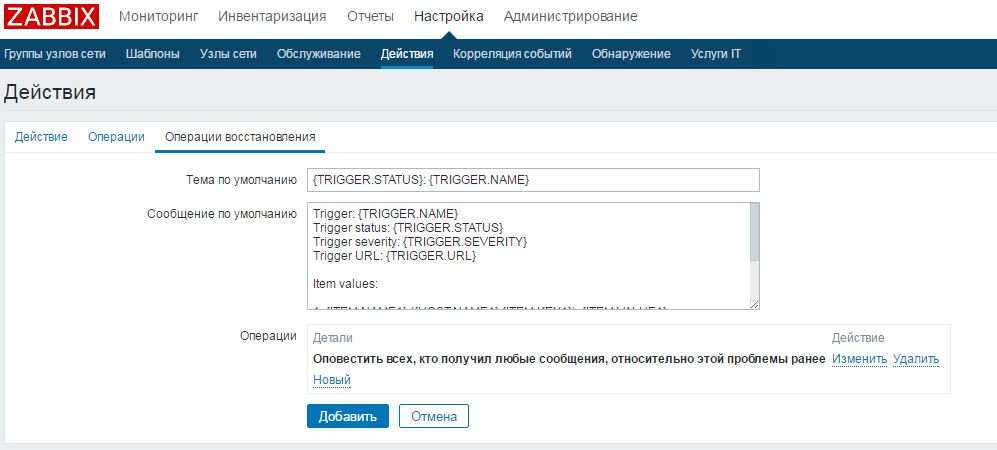 Тут же можете шаблоны поправить так, как вам нравится. Это нововведение 5-й версии Zabbix – правка шаблонов оповещений в настройках самих оповещений. Это позволяет создавать для каждого типа свои шаблоны. Очень удобно.