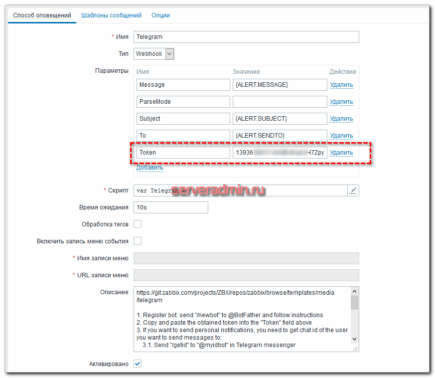 Внутри увидите некоторые параметры. Можно так же посмотреть текст скрипта, который используется для отправки оповещений. В целом, тут сейчас не обязательно что-то менять. Дефолтные настройки полностью рабочие. Надо только указать токен бота.