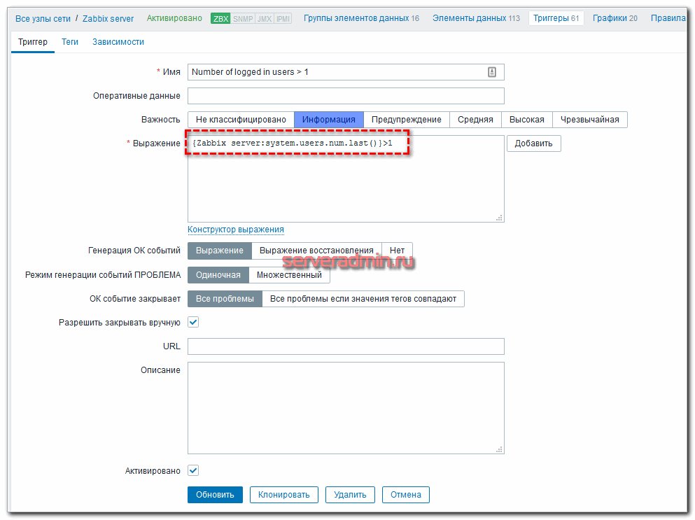 Итак, убедились, что сообщения в telegram нормально отправляются. С технической стороны проблем нет. Теперь настроим отправку уведомлений по событиям. Я обычно для этого использую тестовый триггер. В стандартном шаблоне zabbix для OS Linux есть элемент данных Number of logged in users, который считает количество залогиненных пользователей. Я для него делаю триггер, чтобы он срабатывал, когда пользователей 2 и более. И с его помощью тестирую уведомления, просто подключаясь на сервер по ssh двумя подключениями одновременно.