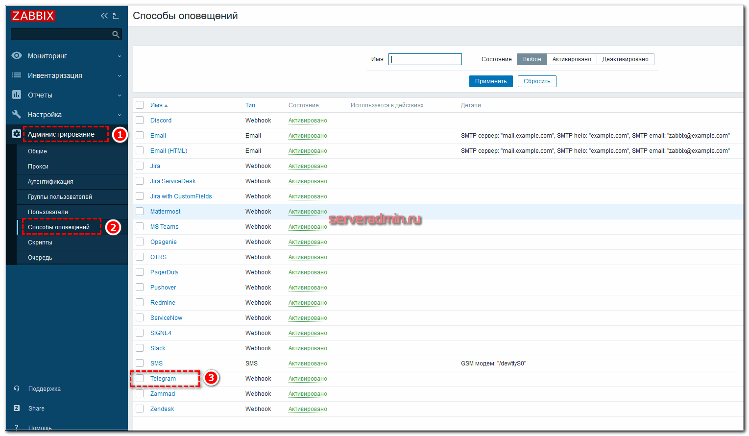 Теперь переходим в веб-интерфейс Zabbix’а и переходим по Меню: «Администрирование» -> «Способы оповещения» и нажимаем «Создать способ оповещения»
