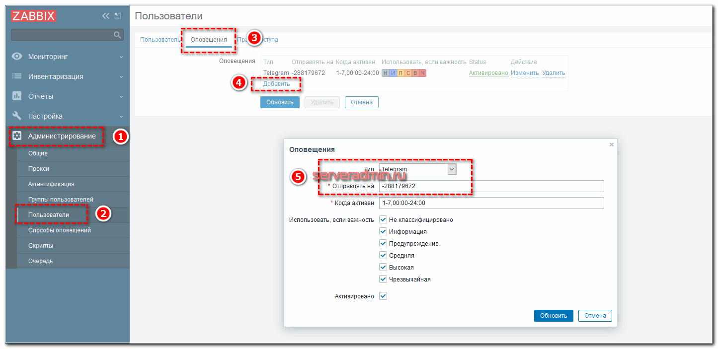 Далее заходим в «Администрирование» -> «Пользователи«. Выбираем нашего пользователя и переходим на вкладку «Оповещения» и нажимаем «Добавить»