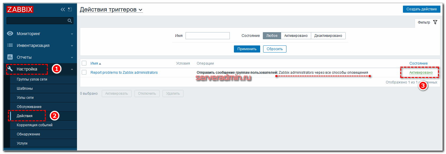 ZABBIX – Создание действия.