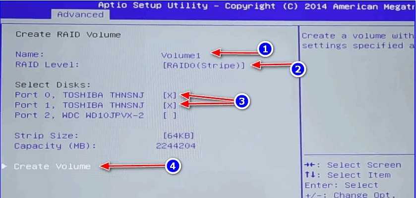Здесь производим основные настройки нашего будущего RAID 0 массива.