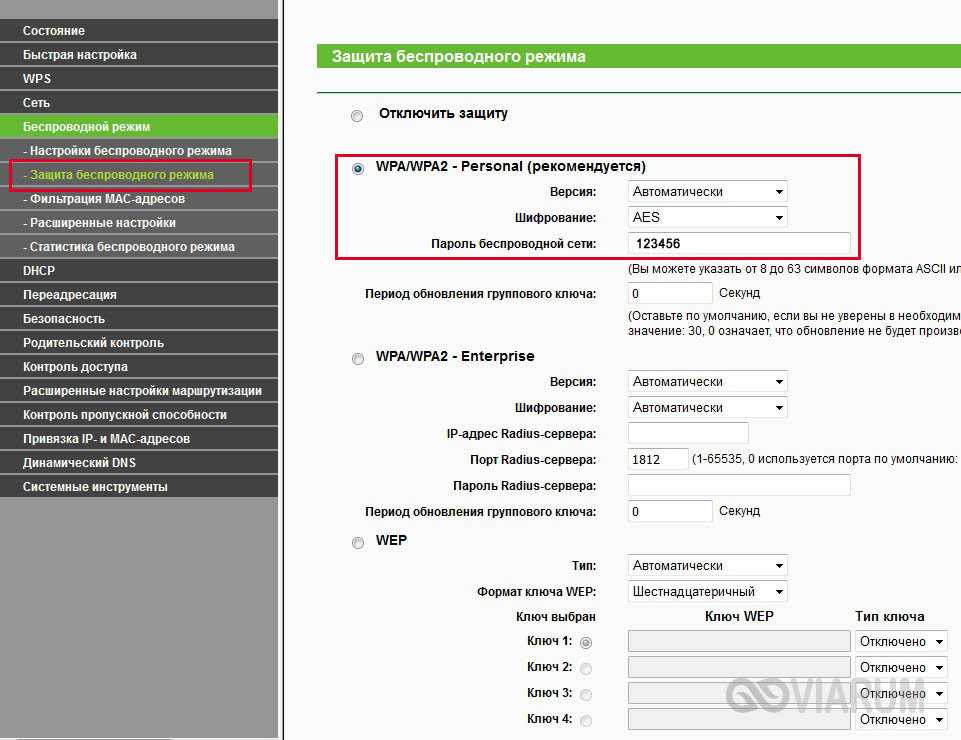 Устанавливаем переключатель в положение «WPA/WPA2 — Personal (рекомендуется)». Далее выбираем версию, тип шифрования и задаем пароль. Сохраняем произведенные изменения.
