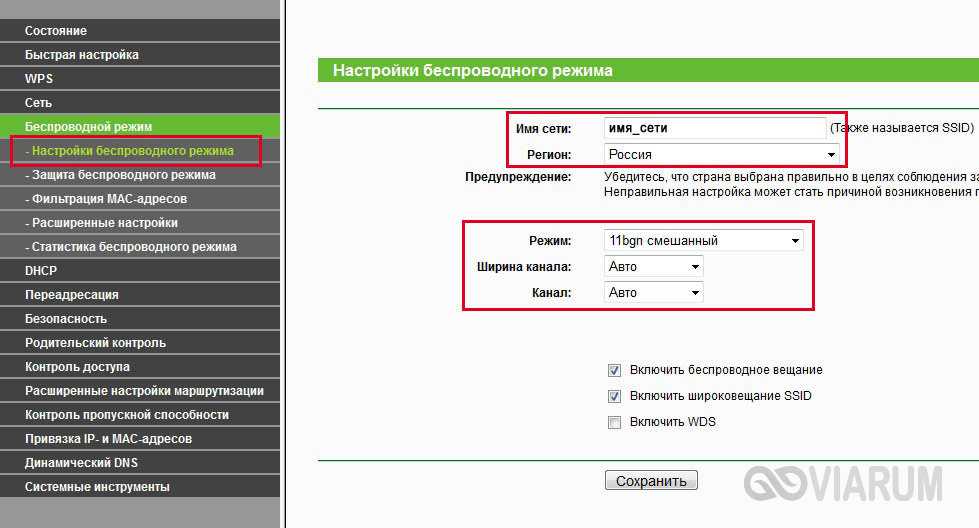 В меню «Беспроводной режим» — «Настройки беспроводного режима». Требуется ввести данные с параметрами «Имя сети» и «регион». Требуется помнить о необходимости сохранить все произведённые действия.