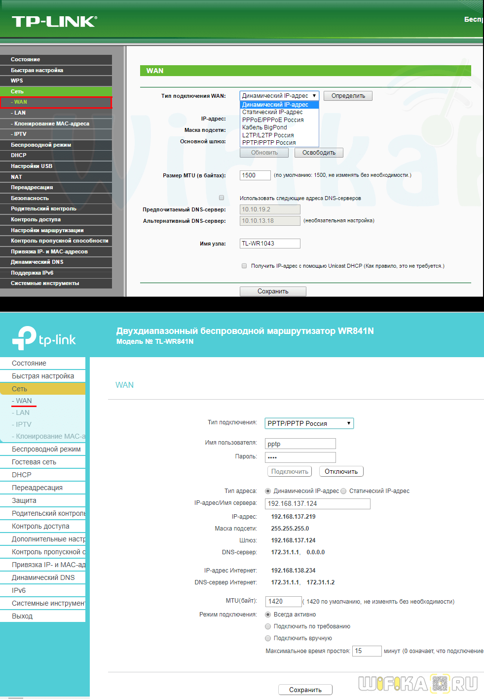 Выбираем в разделе меню «Сеть» пункт «WAN» и производим основные параметры подключения роутера TP-Link к интернету. Для этого нужно будет установить тип подключения, логин, пароль. Возможно, данные об IP адресе, маске и шлюзе — все это должно быть прописано в договоре на оказание услуг интернета от вашего провайдера, либо можно просто позвонить в его техподдержку и узнать эти данные для настройки. В качестве примера приведу самые популярные.