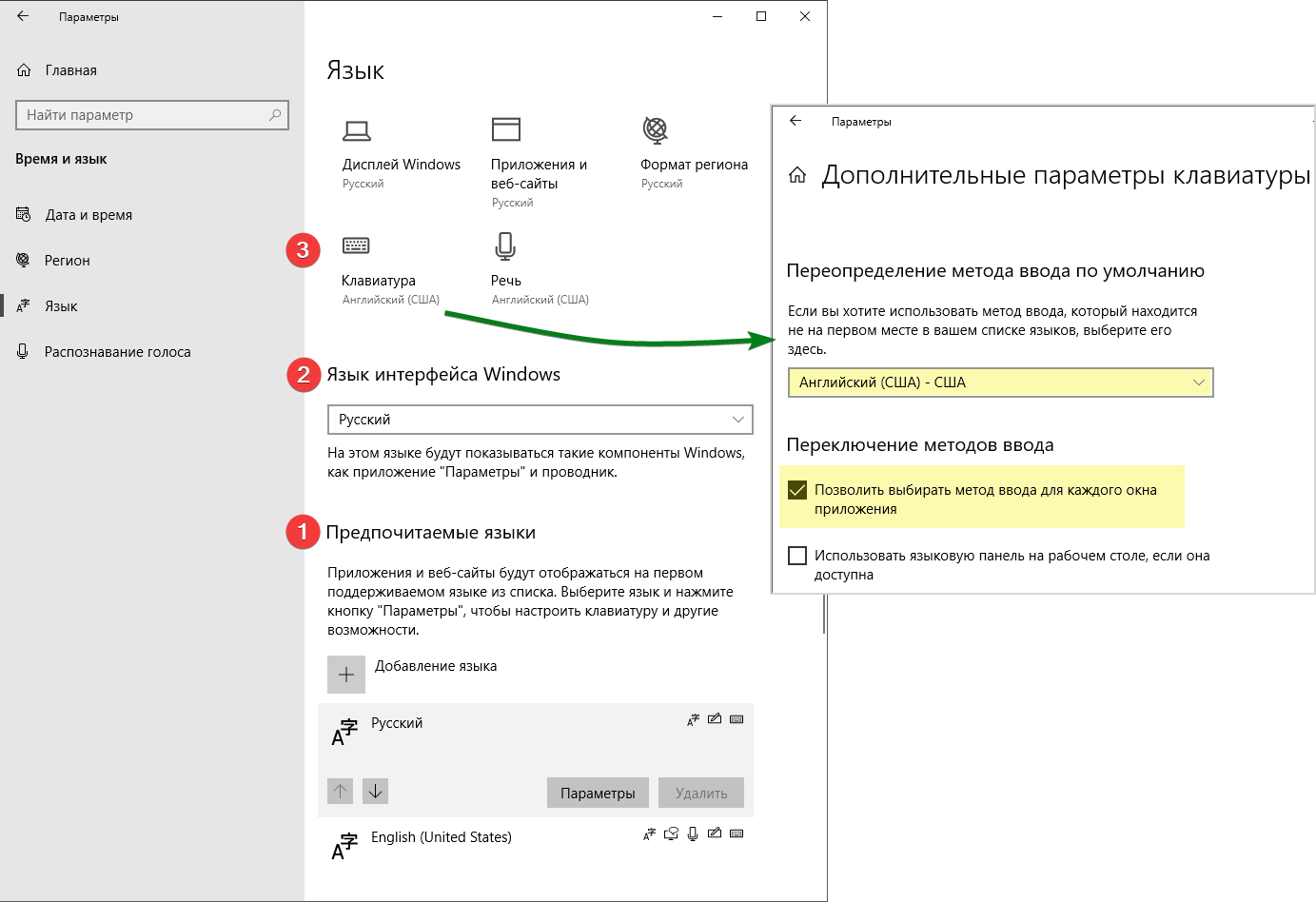 Примечание. Эта картинка из версии 20H1. Здесь написано, как найти дополнительные параметры клавиатуры (п. 3 ниже) в предыдущих версиях Windows 10.
