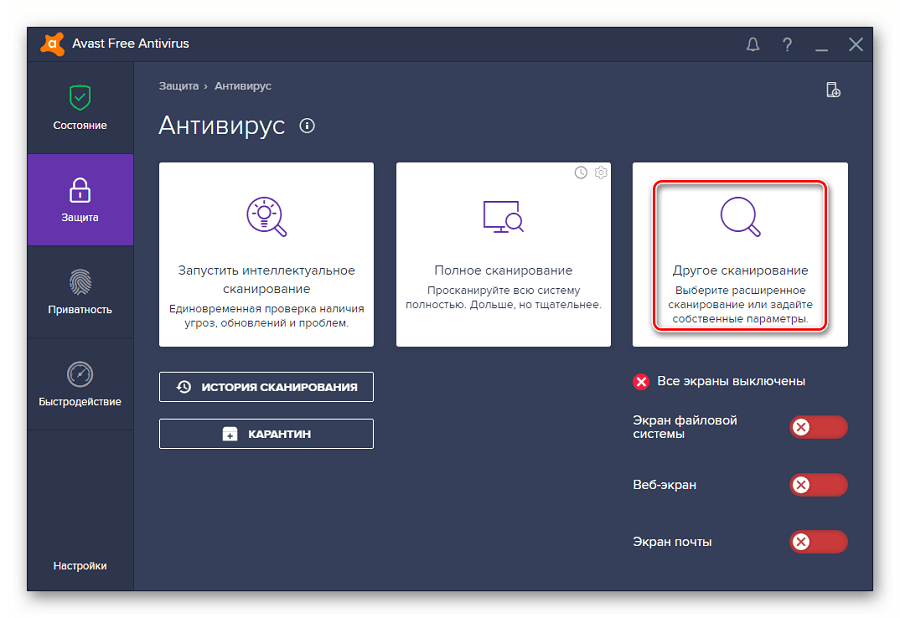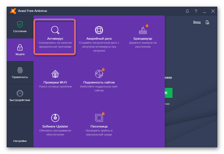 Шаг 1. Открыть интерфейс антивируса «Avast» (пример), перейти в блок «Защита» и выбрать пункт «Антивирус».