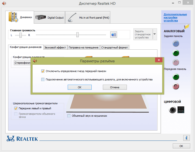 Во многих компах имеется Диспетчер Realtek HD — программная оболочка для настройки звука. Она отвечает за взаимодействие с драйверами. С помощью RHD на некоторых звуковухах можно настраивать аудиоразъемы, расположенные в передней и задней частях ПК. Это может пригодиться, если звук пропал из-за путаницы в аудиовыходах или неисправности одного из разъемов.