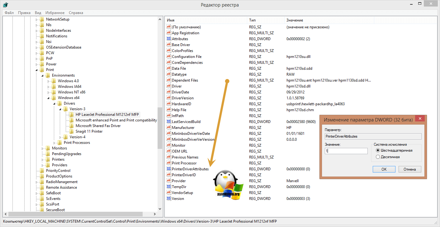 Находим там параметр PrinterDriverAttributes, по умолчанию там будет стоять значение 0, нужно поменять его на 1. После чего вы смело перезагружаете службу печати либо же сам сервер.