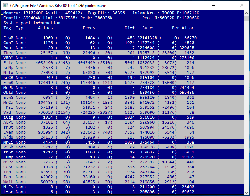 Для этого нам понадобится консольная утилита Poolmoon.exe , входящая в комплект разработки Windows Driver Kit (WDK). С сайта MSFT скачайте и установите WDK для вашей версии Windows и запустите утилиту Poolmon.exe (в WDK для Windows 10 утилита находится в каталоге C:\Program Files (x86)\Windows Kits\10\Tools\.