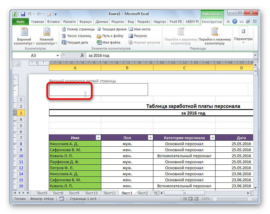 После этого Эксель переходит в режим разметки, а на листах отображаются колонтитулы. Они располагаются в верхней и нижней области. Кроме того, каждый из них разделен на три части. Выбираем, в каком колонтитуле, а также в какой его части, будет производиться нумерация. В большинстве случаев выбирают левую часть верхнего колонтитула. Кликаем по той части, где планируется разместить номер.