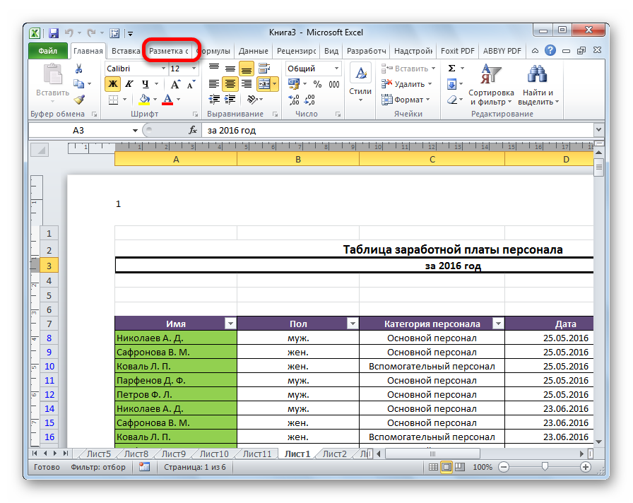 - В горизонтальном меню переходят во вкладку «Разметка»;