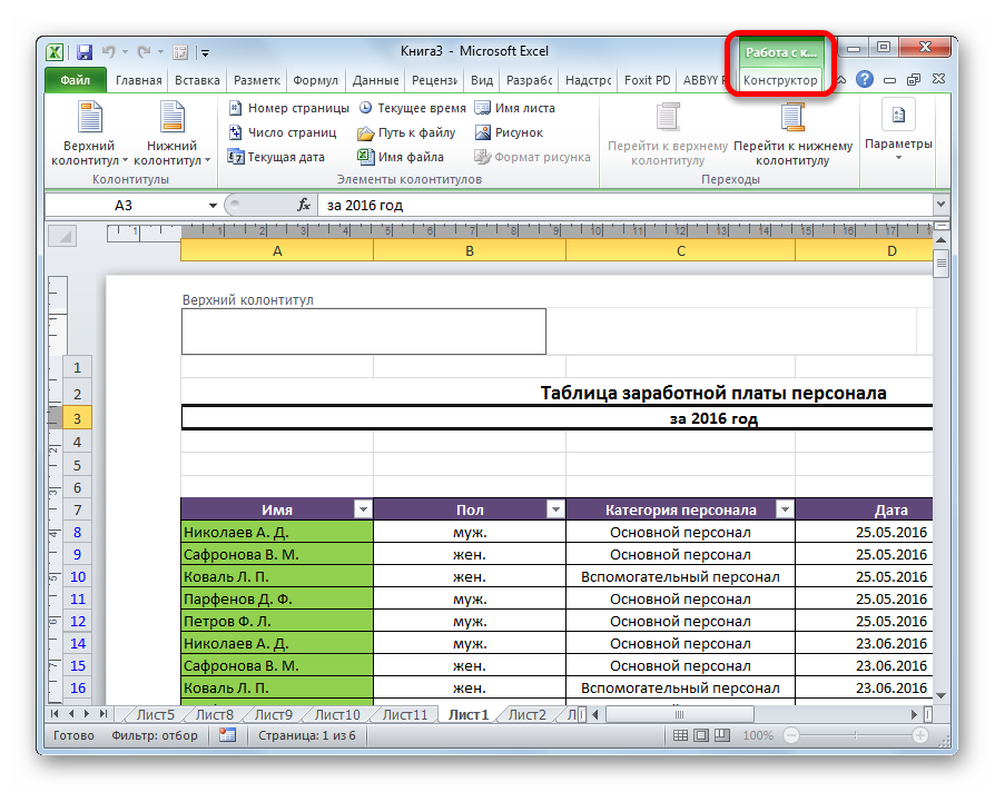 - Переходим в режим колонтитулов. Далее перемещаемся во вкладку «Конструктор колонтитулов», расположенную в блоке вкладок «Работа с колонтитулами».