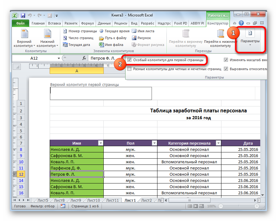 В блоке инструментов «Параметры» на ленте отмечаем галочкой пункт настроек «Особый колонтитул для первой страницы».